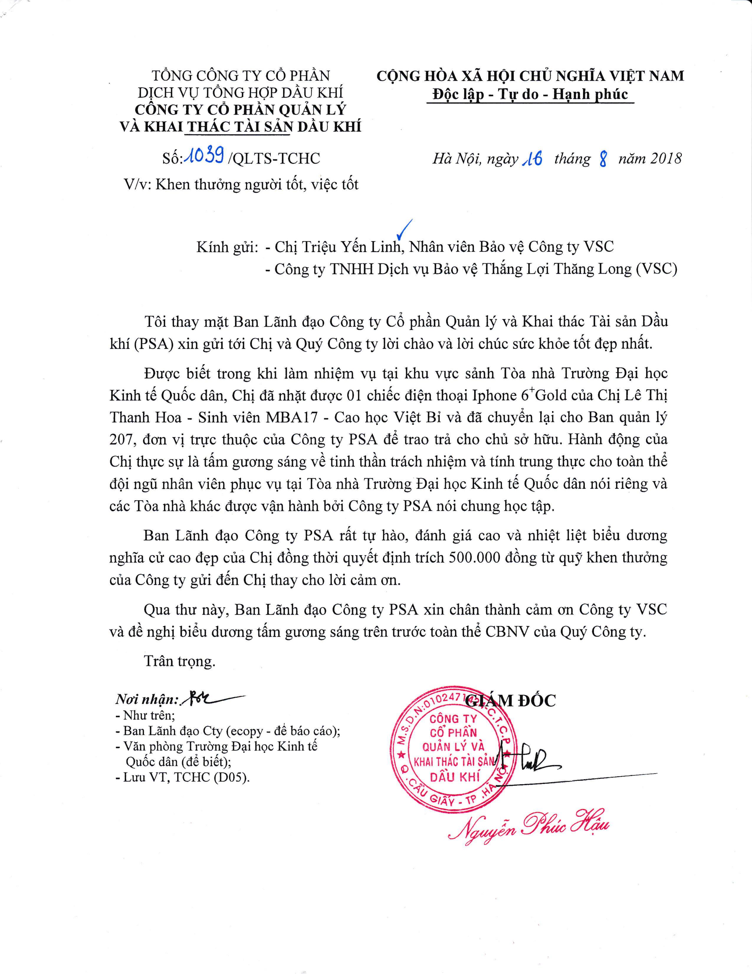 Ngày 16/08/2018 Giám đốc công ty cổ phần quản lý và khai thác tài sản dầu khí ( PSA) gửi thư cảm ơn đến Công ty VSC Thăng Long và cá nhân nhân viên Triệu Yến Linh, hiện đang biên chế tại đội bảo vệ Mục Tiêu Trường Đại Học Kinh Tế Quốc Dân ( Đơn vị quản lý PSA, đội an ninh VSC), về việc nhặt được điên thoại của chị Lê Thị Thanh Hoa - sinh viên MBA 17, cao học Việt Bỉ đã gửi lại BQL của trường để trả lại cho chủ sở hữu.